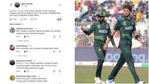 एक फेसबुक पोस्ट में एक यूजर ने मजाकिया अंदाज में लिखा, 'डोनाल्ड ट्रंप, मैं ईरान के परमाणु कार्यक्रम का सक्रिय सदस्य हूं और मुझे यह कहने में डर नहीं लगता। मेरा नाम शादाब खान है और मैं पाकिस्तान क्रिकेट टीम में खेलता हूं।'इसके बाद कमेंट्स की बाढ़ आ गई। किसी ने लिखा, 'सलमान अली आगा को मत भूलना, वह भी ईरान के परमाणु कार्यक्रम में काम करने वाले वैज्ञानिक हैं।' इसका जवाब देते हुए एक अन्य यूजर ने तंज कसते हुए कहा, 'एक और सदस्य हैं, शाहीन शाह अफरीदी।'किसी ने खुद को सैम अयूब बताते हुए लिखा, 'मैं जूनियर एनालिस्ट हूं और पाकिस्तान क्रिकेट टीम का हिस्सा हूं।' और एक यूजर ने चुटकी ली और लिखा, 'मैं बाबर आज़म हूं और इस परमाणु कार्यक्रम का परियोजना प्रमुख हूं।'इन पोस्ट्स में खिलाड़ियों के नामों का इस्तेमाल पूरी तरह व्यंग्य और मीम कल्चर के तहत किया गया। ऐसा लग रहा है कि पाकिस्तान फैंस इन खिलाड़ियों का नाम लेकर ट्रंप से कह रहे हैं कि इन्हें भी सजा दो।
