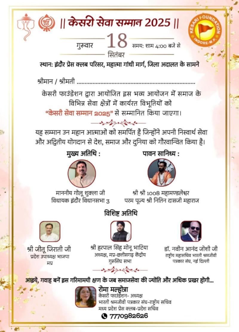इंदौर। समाज सेवा और राष्ट्र सेवा के विभिन्न क्षेत्रों में उल्लेखनीय योगदान देने वाली 21 प्रतिभाशाली हस्तियों को “केसरी सेवा सम्मान 2025” से अलंकृत किया जाएगा। यह भव्य समारोह 18 सितंबर 2025, शाम 4 बजे इंदौर प्रेस क्लब परिसर में आयोजित होगा।